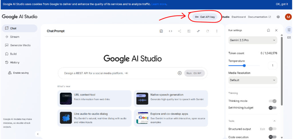 1. After logging in, you will see the main Google AI Studio dashboard.
