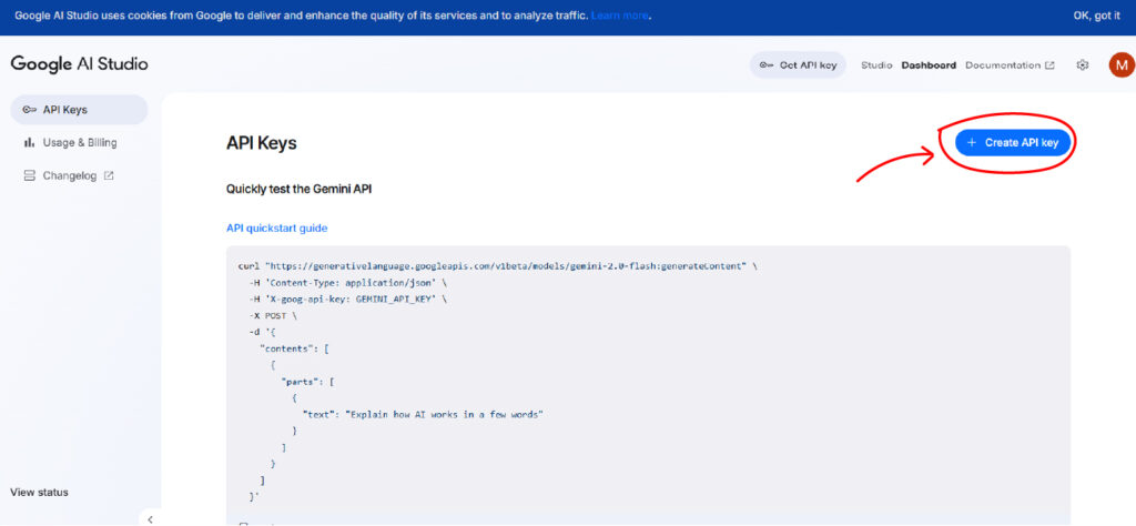 2. Click the blue “+ Create API key” button in the top right corner.
