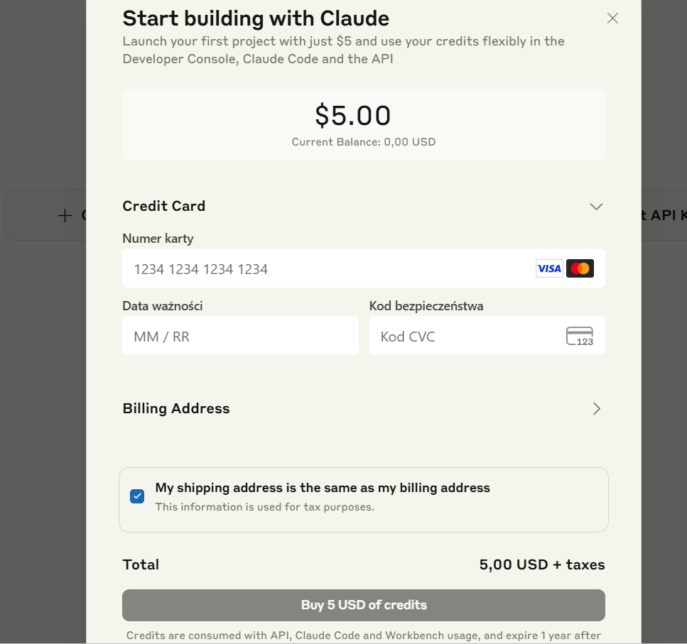 1. Otworzy się okno „Start building with Claude” z formularzem płatności:
