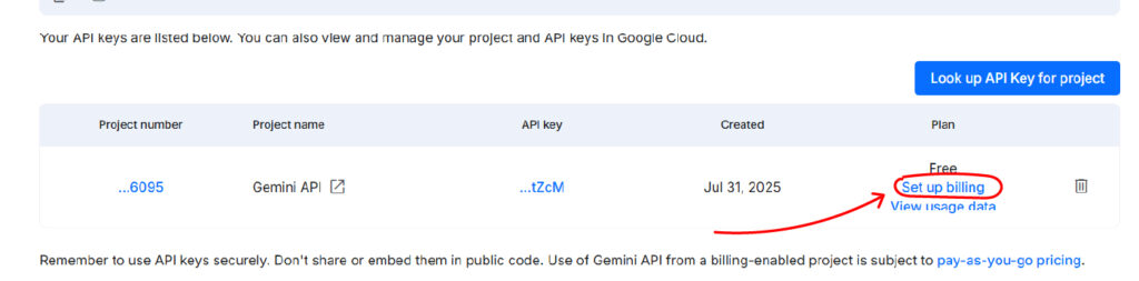 1. At the bottom of the “API Keys” screen, click the “Set up billing” button in the row with the API key that was just generated.