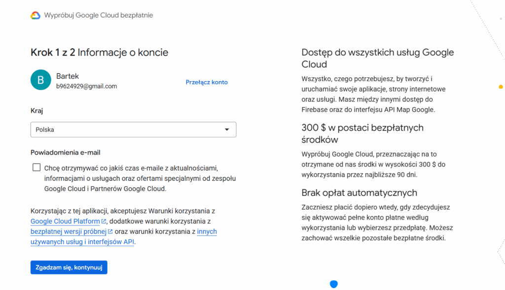 • Powiadomienia e-mail: – Możesz zaznaczyć opcję otrzymywania aktualizacji o usługach Google Cloud jeśli jesteś tym zainteresowany(a)