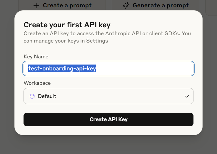 1. The “Create your first API key” window will open: