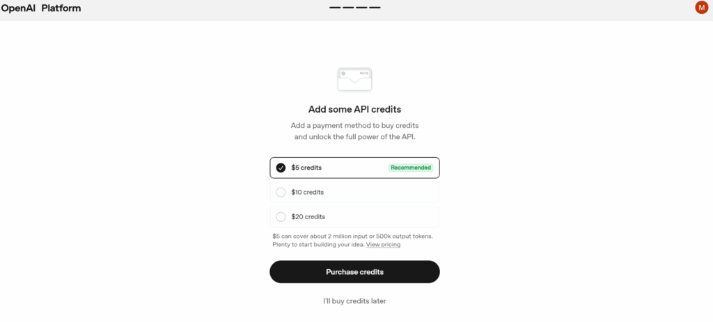 Kliknij „Buy 5 USD of credits”
