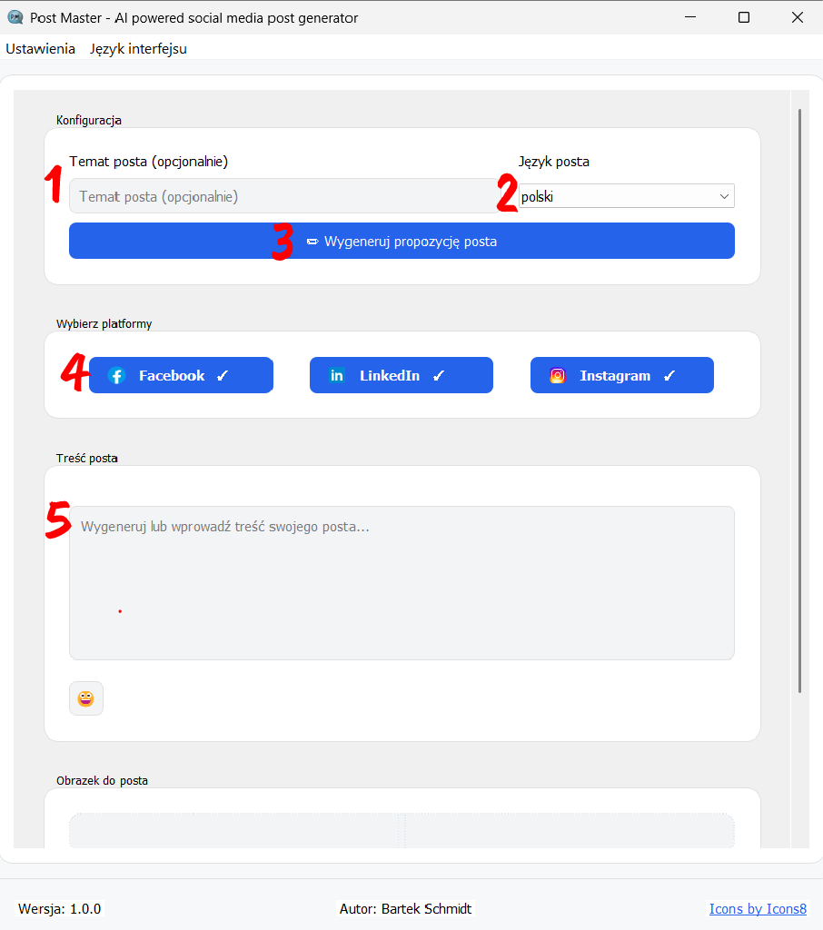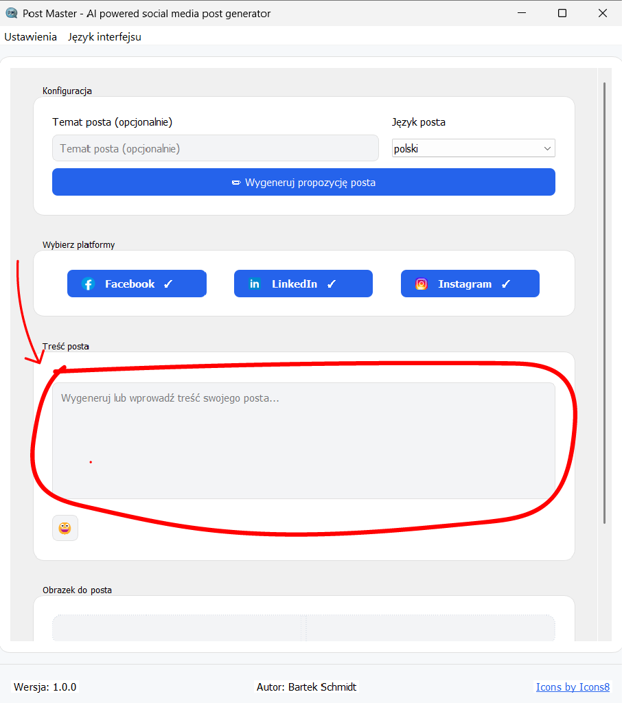 2. In the "Post language" field, select from the list the language in which the text should be generated (e.g., "Polish").